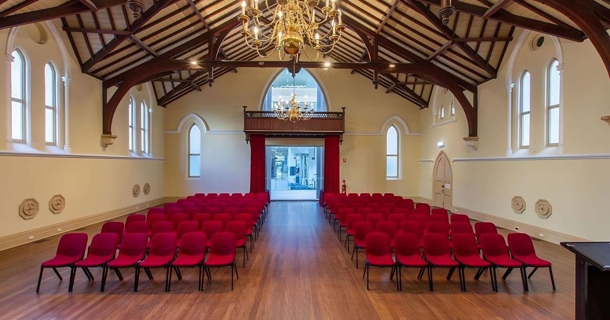 Welcome to the city’s hidden gem, the traditional Meeting Hall. Timber floors, high vaulted ceilings and chandeliers, set the scene in the charming Meeting Hall. Retaining much of its 1862 charm, the Meeting Hall is a traditional blank canvas for you to dress up and enjoy. When you hire the Meeting Hall, you’ll get access to a private space that feels miles away but is tucked away in the middle of Adelaide’s CBD. Features Upright Alex Steinbach piano Inbuilt stage Fixed theatre lighting and sound