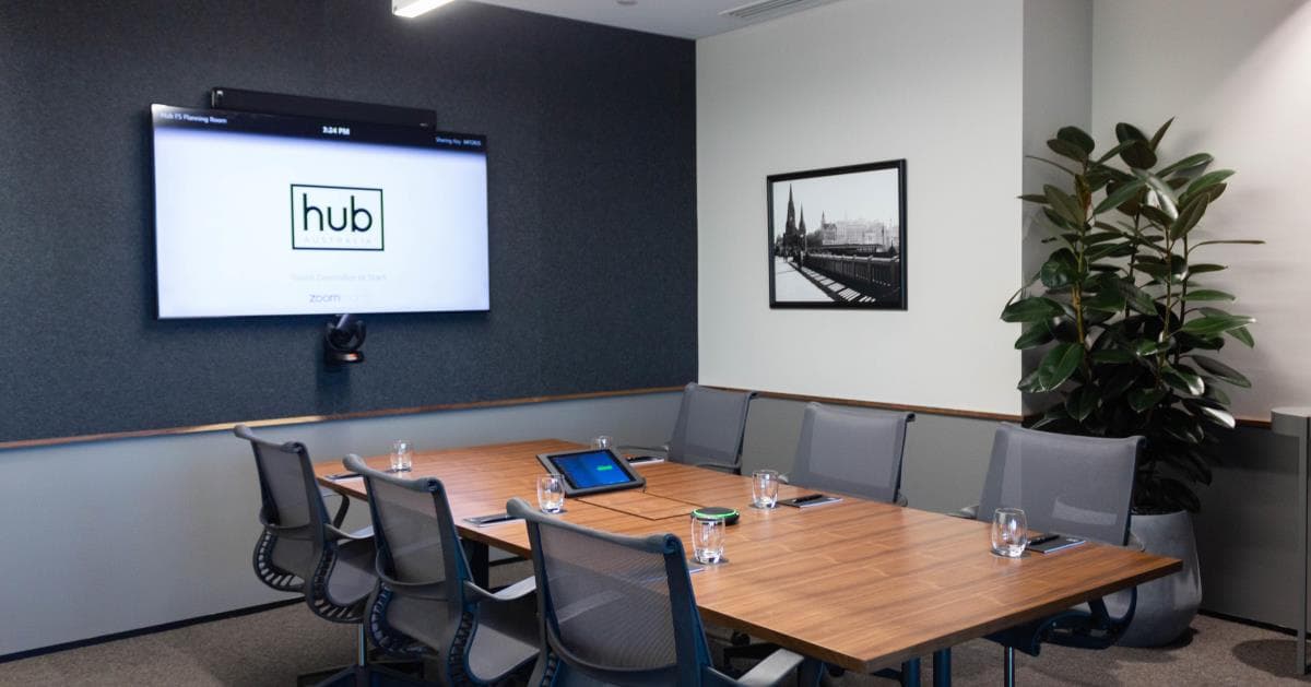 Bring your team, clients, or stakeholders together in Hub Flinders Street's centrally-located and fully-connected strategy space. -Ideal for meetings and client presentations -10-person capacity -65″ screen with Zoom video conferencing kit -Glass whiteboard -Dimmable lights -Catering & barista coffee available