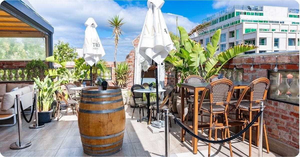 Sink into the embrace of our plush booth seating or gather around wine barrrels right next to the main bar. This space effortlessly combines comfort and style. Full retractable roof and side awnings plus heaters to keep you warm in winter and misters to keep you cool in summer.