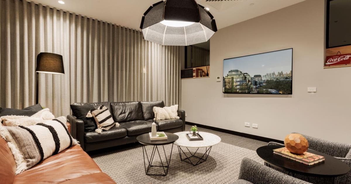 Our Presenter Lounge is the perfect space for a more relaxed space to impress clients or bring the team together. This room includes comfortable seating for 8-10 guests with a screen to present wirelessly. If you'd like refreshments for your meeting, you can order coffees and catering from our onsite cafe, and have them delivered to you. Casual lounge setting with two 3 seater couches, two occasional chairs and coffee/side tables Sheer curtains to provide privacy and ambience 65″ high-quality commercial presenter display screen Wireless screen-sharing technology or HDMI connection Complimentary filtered water Wheelchair accessible (please speak to our team) Conveniently order coffee Need a larger room? See our other listings for our Training Rooms & Boardrooms which seat up to 22 people.