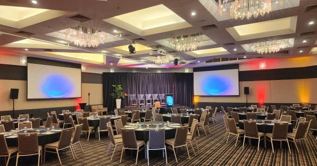 The grand ballroom hosts large weddings and is suitable for meeting or any event space requirements. This function room can accommodate up to 580 people standing and 350 seated. Below are some inclusions for function room use. They have an on-site audiovisual tea and dedicated meetings manager to ensure your event runs smoothly.