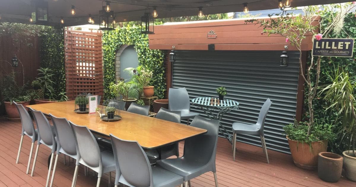 This garden sanctuary is the newest function area within Bitton. The space features French styled tables with gingham table cloths, a wall of Parisian artwork and cascading vines across the wooden garden fencing. With the picturesque backdrop of herb gardens, and large wine barrels filled with greenery, our team can style and configure this elegant space to suit any occasion. Maximum seating capacity 30 seated or 60 cocktail style. FEATURES OF LE JARDIN Outdoor Space Cover for inclement weather (not heated) Variable table configuration