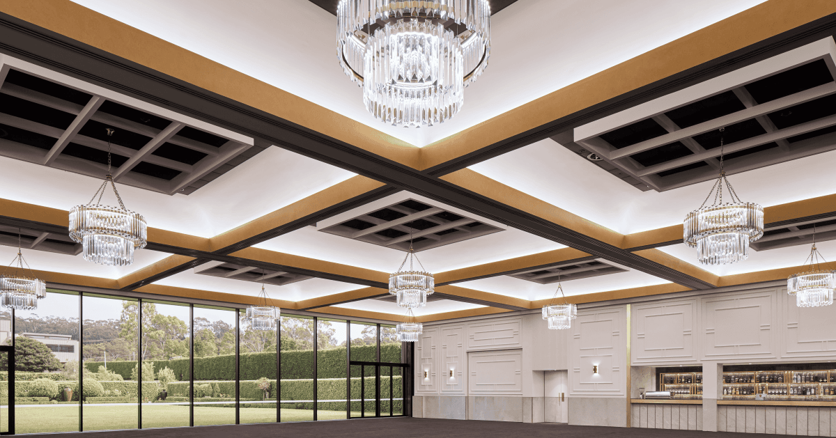 The Grand Ballroom featuring 6 metre high ceilings with a magnificent feature wall of floor to ceiling windows allowing you to take in the spectacular views of the lush gardens and water features. With a total pillar free space of 1150 square metres, use your imagination to create a magical setting for your dream event. A two tonne winch in the ceiling means you can suspend the most complex of sound, lighting, audio visual and décor.