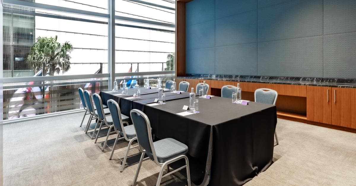 Ideally located in a corner overlooking Darling Harbour and the International Convention Centre, the 37sqm Russell Room offers ample daylight and beautiful views through its floor-to-ceiling windows. With its high ceiling, stately board table and elegant marble and leather details, it is one of our most popular meeting rooms. It can comfortably accommodate up to 14.
