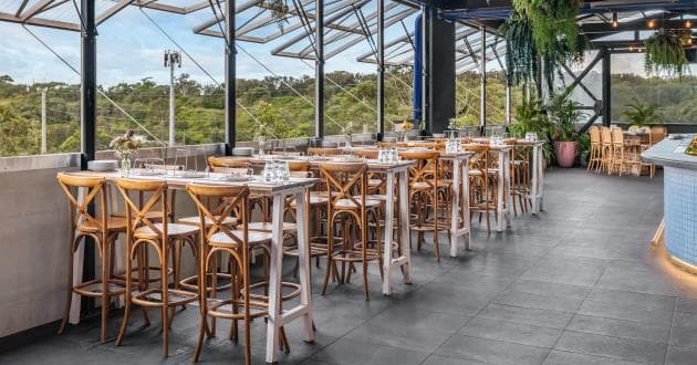 Combining the relaxed charm of The Island with the elevated outlook of the Sky Tables, this semi-private space is perfect for corporate gatherings, birthdays, and social celebrations. Framed by the Big Louvre windows, The Island features wooden tables and striped bamboo chairs for a laid-back holiday feel—ideal for seated banquets, grazing tables, or cocktail masterclasses. Flowing through to the Sky Tables, guests can enjoy views over the leafy skyline of Macquarie Park, surrounded by potted palms and The Gov’s hand-painted mural. With seating and standing room throughout and easy access to the bar, it’s a vibrant space designed for mingling and memorable events.