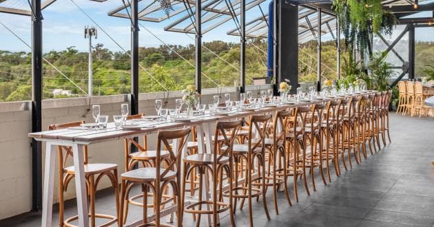 Offering an exclusive wooden deck complete with festoon lighting and a retractable roof area high above Macquarie Park. The Rooftop Terrace is the perfect space for a special celebration or corporate get-together with plenty of space for you to bring in theming, backdrops and media walls. With portable heaters in the space in the winter, and misters in the summer, The Rooftop Terrace is perfect for canape events and grazing tables all year round, with scenic views sure to impress.
