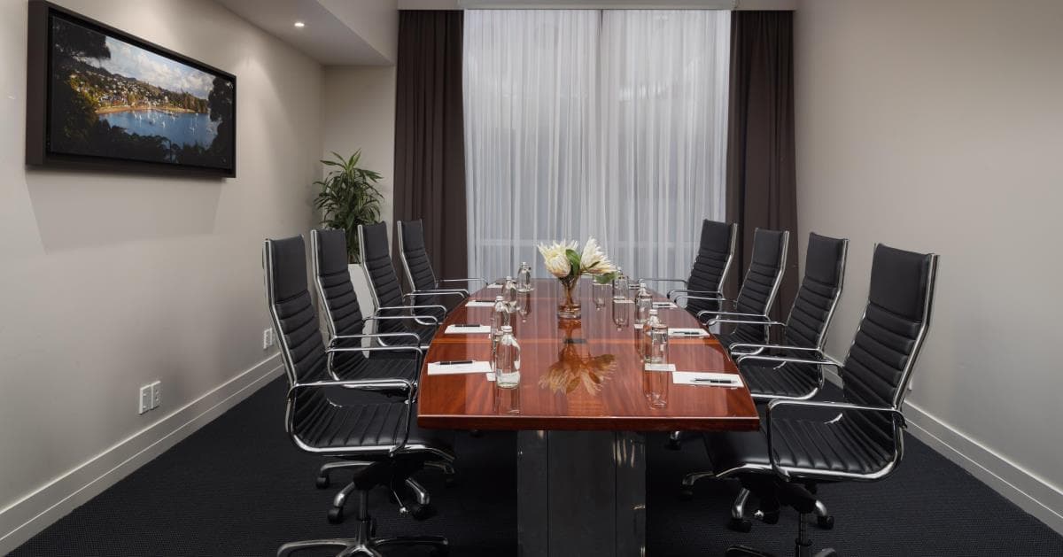 Executive room 1 is our smallest meeting spaces at 23sqm. This room can accommodate up to 10 people so is perfect for those smaller board meetings. Executive room 1 has an abundance of natural light with floor to ceiling windows and with its stylish leather seats and wooden boardroom table – it is a room to impress. Executive room 1 features individual climate controlled air-conditioning, state of the art built-in audio visual equipment including a dedicated on-site audio visual technician for technical support and instant communication to your dedicated event supervisor.