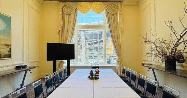 Our unique Spencer Room features Victorian silk curtains which frame the large windows which fill this space with an abundance of natural light. The perfect space for breakout room, boardroom, cabaret, theater style, private lunch, or dinne...