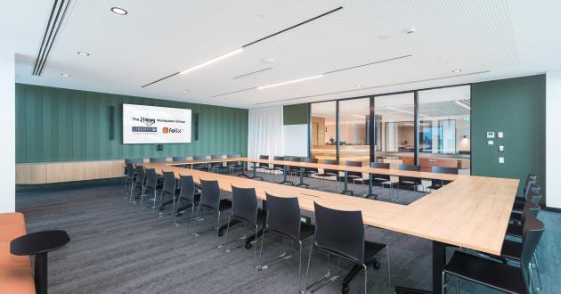 Welcome to the Jarrah Boardoom: A moody, modern 24-person meeting room, with professional office chairs, large table, Logitech video conferencing equipment, TV, Laptop HDMI connection, chilled filtered water, client greetings. Additional I...